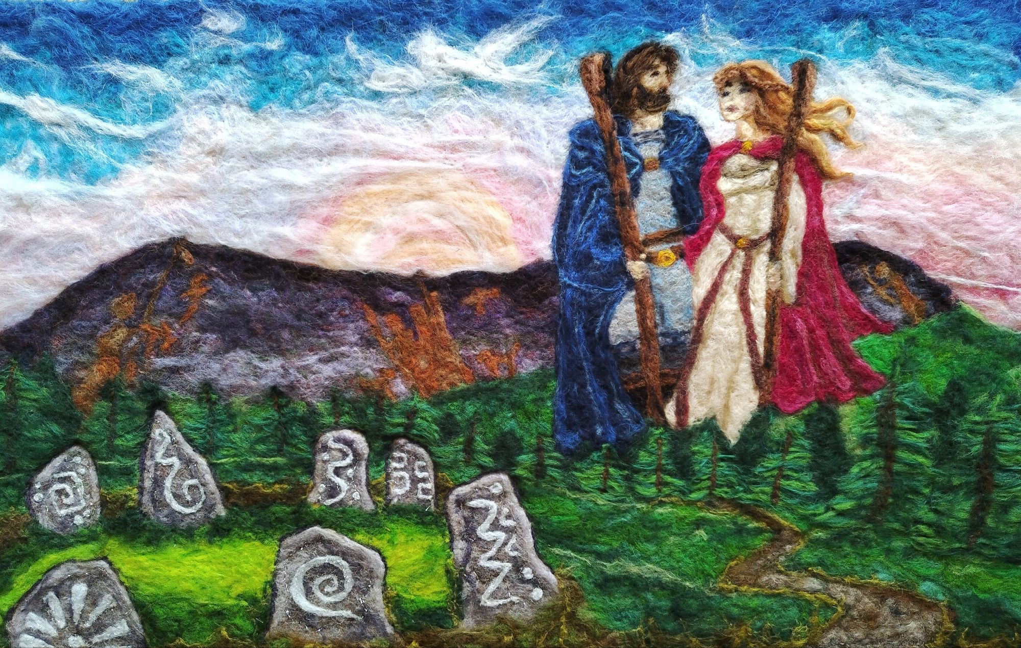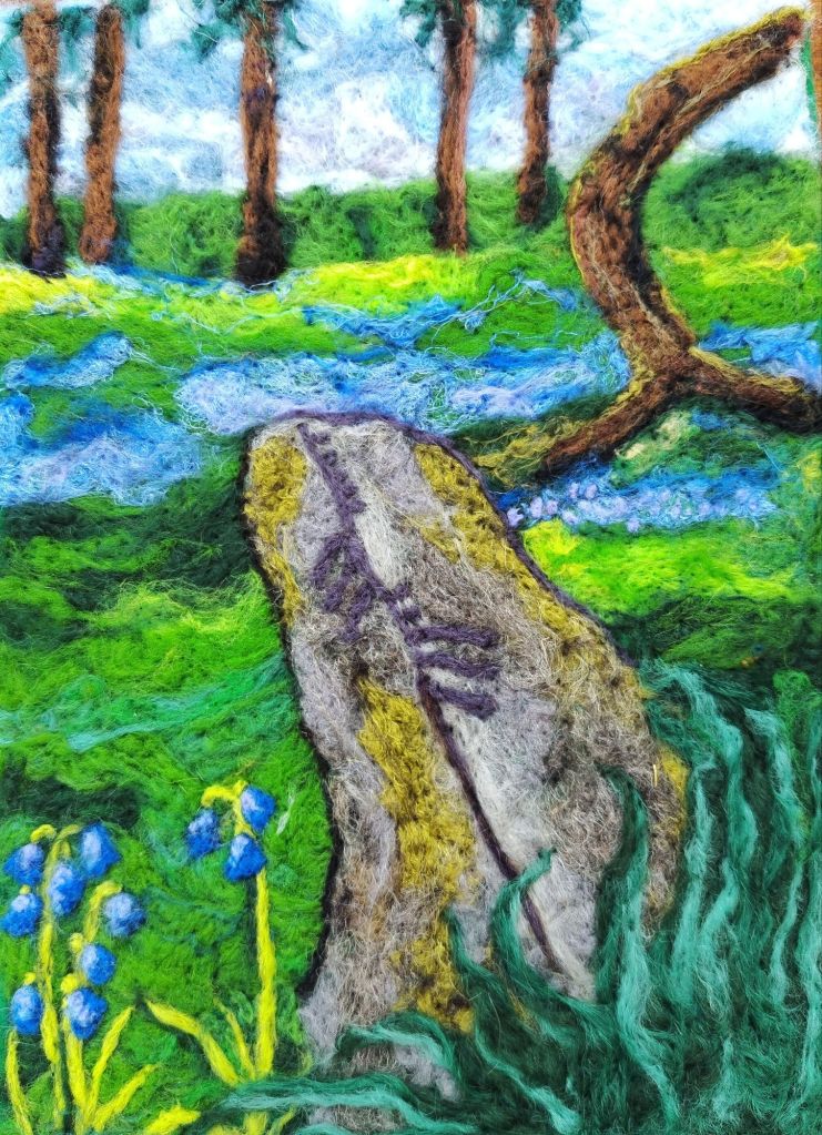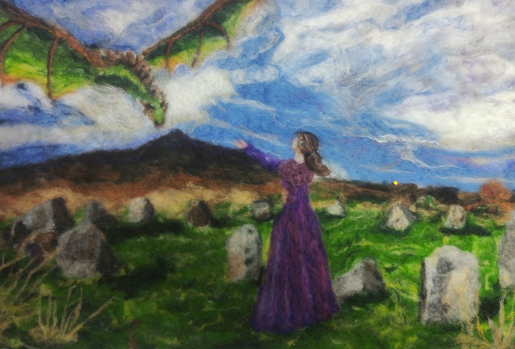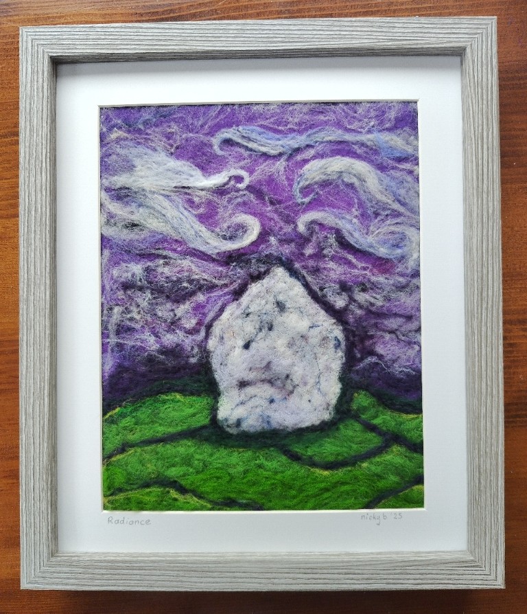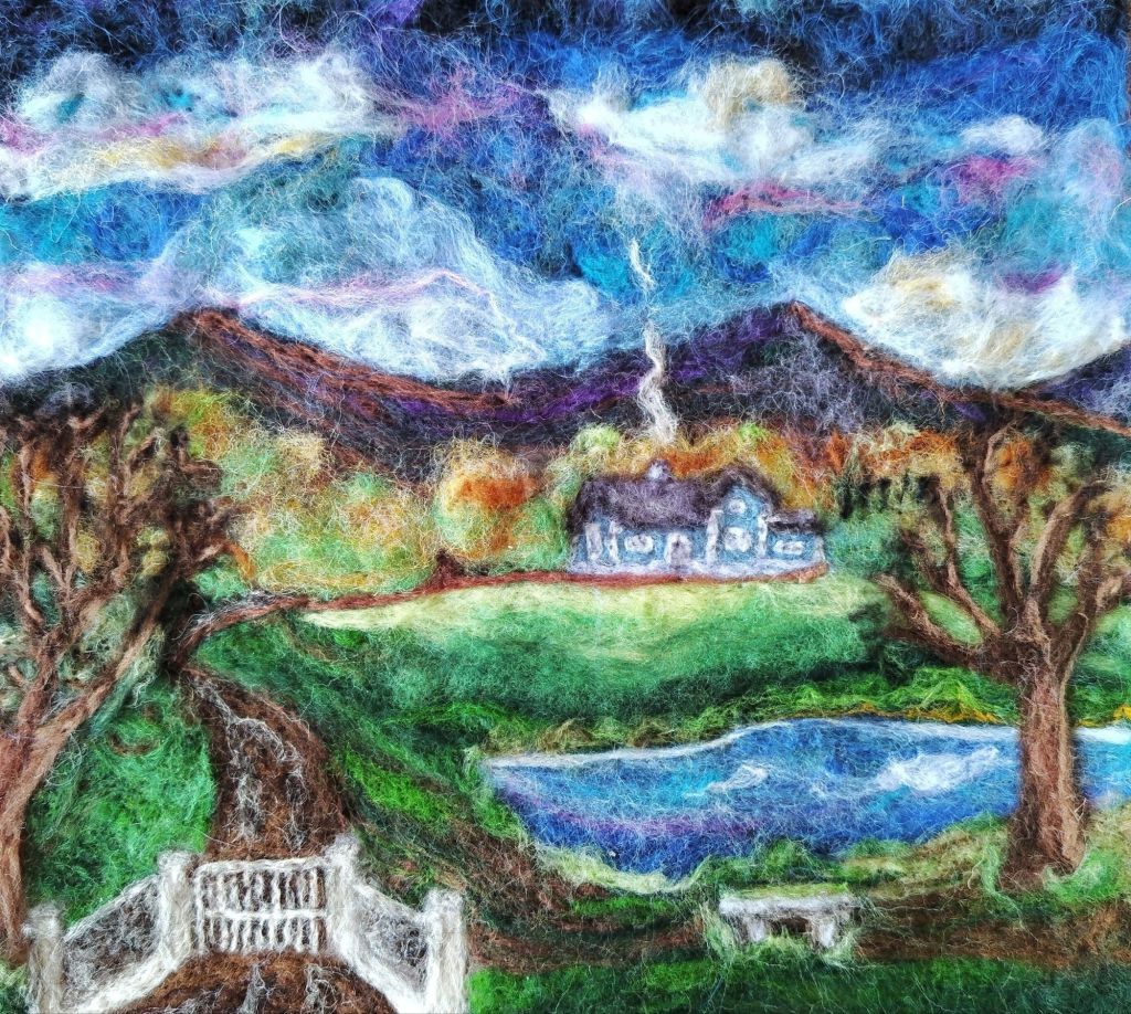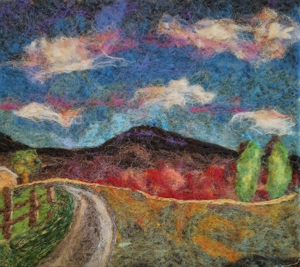On moving to West Wicklow, living under the shadow of Kilranelagh, she discovered the wonderful history, mythology and folklore of Kilranelagh and the surrounding area. Many of the sites on Kilranelagh have fascinating history and folklore associated with them. This inspired her to create a series of needle felted pictures based on the history and mythology of this area. Her aim is to bring the magic of this land to life in her artwork.